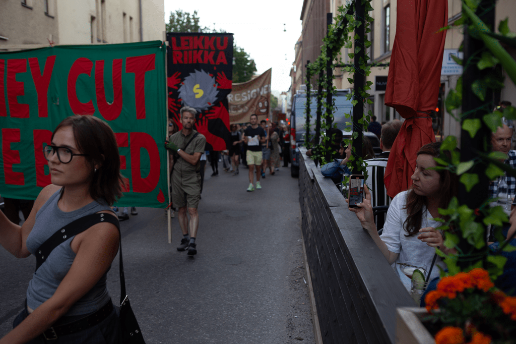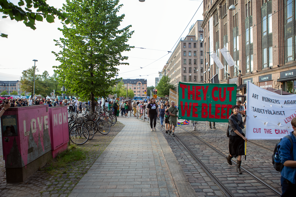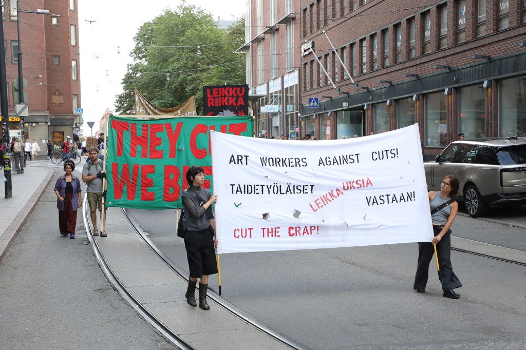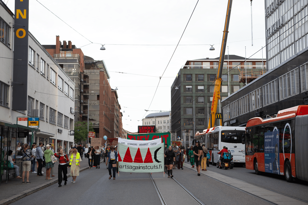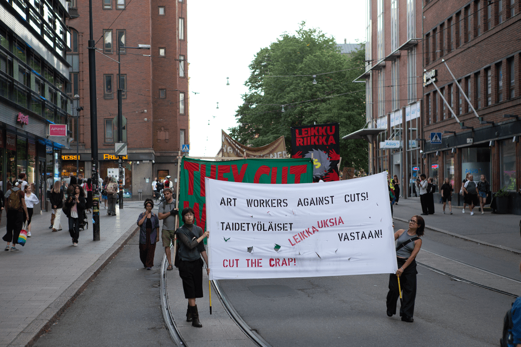 If you want to prepare banners for the March join on Saturday 10th of Aug from 5pm till 8pm and on Monday 12th of Aug from 1pm till 5pm to Arts Against Cuts banner workshop at Museum of Impossible Forms (Aallonhalkoja 9, Sompasaari)